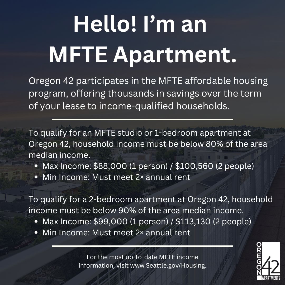 Oregon 42 participates in the MFTE affordable housing program, offering savings of up to $5,195.00 in 12 months compared to market-rate apartments! Terms & restrictions apply – contact us to learn more.Floor Plans